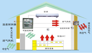 工作原理:智能新風(fēng)系統(tǒng)通過引入室外冷空氣,對機(jī)房溫度進(jìn)行調(diào)節(jié),當(dāng)室內(nèi)溫度達(dá)到22℃(可設(shè)置),室內(nèi)外溫度差△T≥2℃,智能新風(fēng)啟動,向室內(nèi)送入過濾后的冷空氣,室內(nèi)溫度降至18℃(可設(shè)置)時,智能新風(fēng)停機(jī),以此循環(huán)工作。
